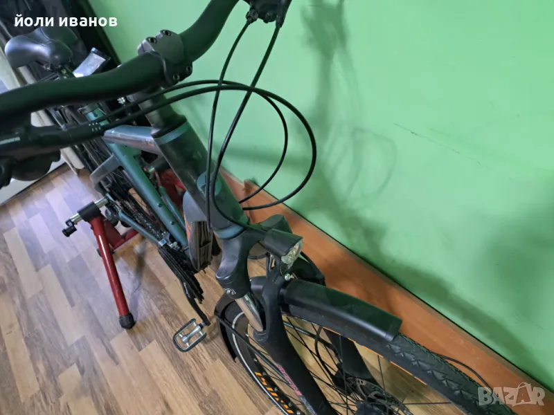 Велосипед 28 цола,алуминиева рамка,52 см размер,амортисьорна вилка,лед фар,динамо главина в предната ос,дискови хидравлични спирачки,палцови команди,24 скорости,заден светещ стоп от динамото,як алуминиев багажник,калници,стойка за колелото,лапа,Алтус дерайльор отзад,колче алуминиево,ф31.6мм,рамката е много здрава,за по тежък човек става също,почти нови гуми,всичко по велосипеда работи,ергомомични дръжки,звънец,подарък помпа