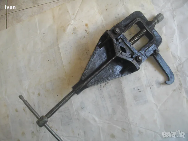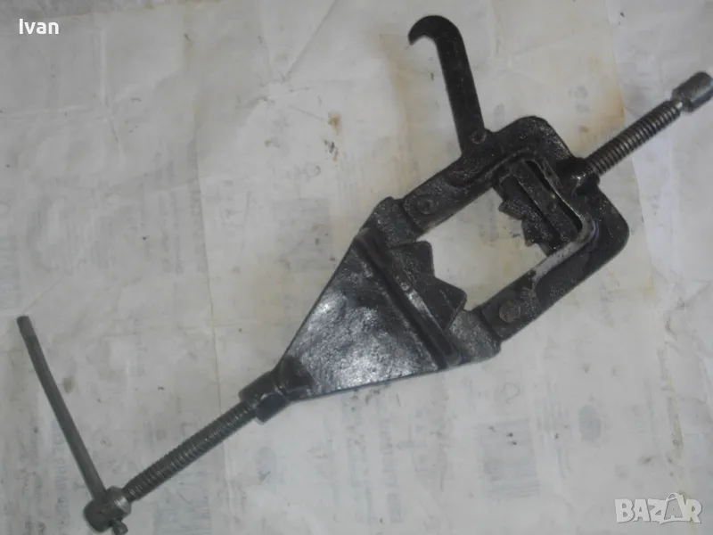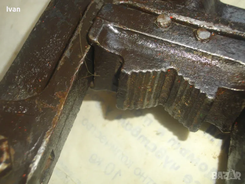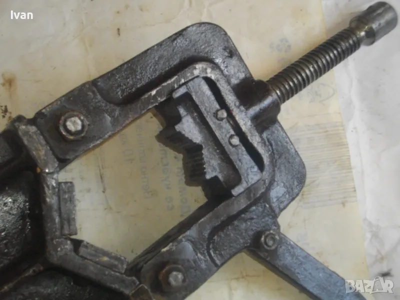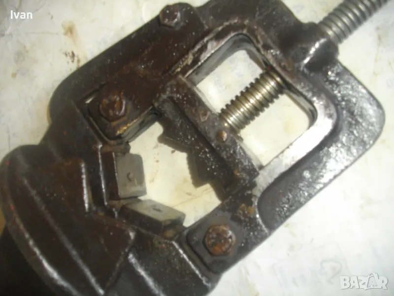 Голямо, масивно, колоритно тръбно българско менгеме от времето на Соца в НРБ , за захват на тръби при направа на резби. Производител маркиран - ТПК "Металика" - Разград. Менгемето е с много запазен външен вид и отлично техническо/работно състояние.