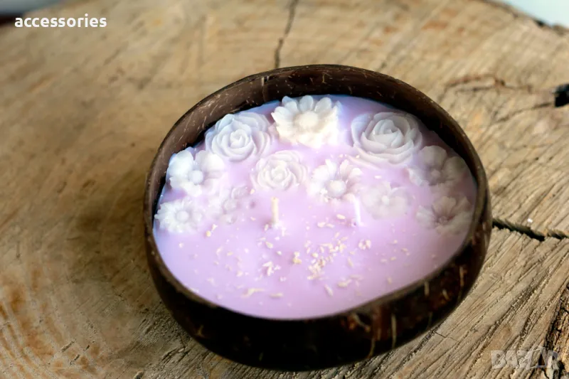 Уникална ръчно изработена свещ в купичка от кокос.