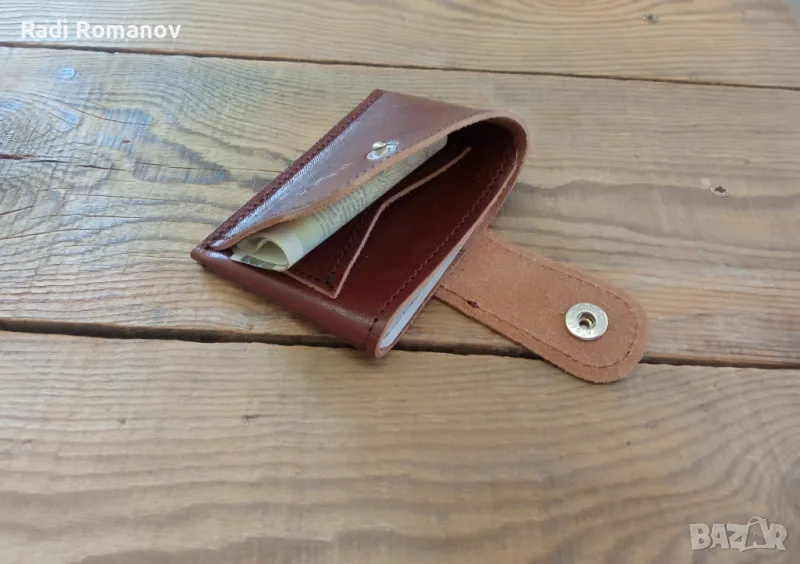Ръчно изработен кожен портфейл, джобен размер.