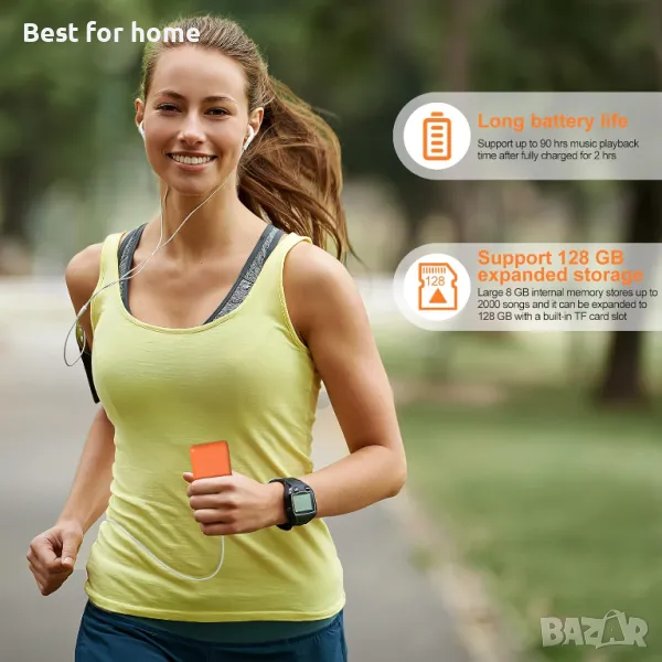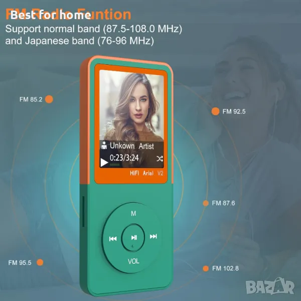 Hi-Fi без загуба на звук, дълго време за възпроизвеждане на музика след 2 часа зареждане, 1,8 инчов сензорен екран с голям екран, можете да четете и гледате повече, достъпът до плейъра е лесен чрез 5 напълно чувствителни сензорни бутона.