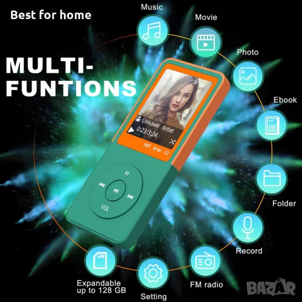 Относно този артикул Дълга продължителност на възпроизвеждане: 2,5 часа при пълно зареждане, поддържа до 50 часа възпроизвеждане на музика чрез слушалки, електронна книга, FM радио, рекордер, часовник, снимки. Наслаждавайте се на музика безплатно Голям капацитет: вътрешна памет от 8 GB може да съхранява до 1000 песни (6 до 8 м). и плейърът със слушалки поддържа разширяем носител за съхранение от micro SD карта (не е включена) до 64 GB. 1,8-инчов TFT цветен екран: 1,8-инчовият TFT цветен екран с висока разделителна способност предлага изживяване с четири очи и придава на екстериора много шик и елегантен вид. Елегантен и елегантен външен вид с изключително леко тегло е най-добрият избор за дейности на открито Качество на звука без загуба на Hi-Fi: висококачествен чип за намаляване на шума, ниско изкривяване. Можете да чуете много детайли с богат бас и чисти високи честоти. Поддържа MP3, WMA, DRM WMA, OGG, monkey (нормален/бърз), flac, wav, ac-lc, acelp, аудио формат и формати ect. Многофункционален: поддържа възпроизвеждане на музика и видео, разглеждане на изображения, FM радио, запис на глас, електронни книги и файлов браузър. Вграден крачкомер, идеален за бягане и пътуване.