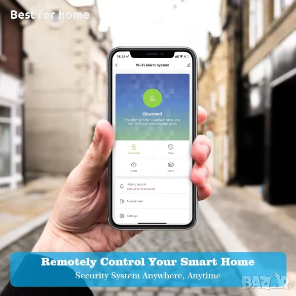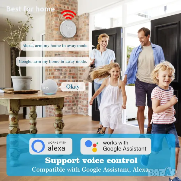 Гласов контрол: Домашна алармена система, съвместима с Alexa и Google Assistant чрез приложението. Режимите „Навън“, „Деактивиране“ и „У дома“ могат лесно да се управляват чрез глас със свободни ръце