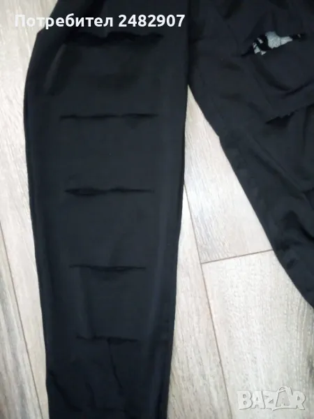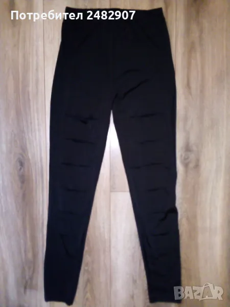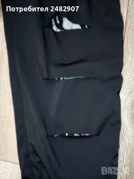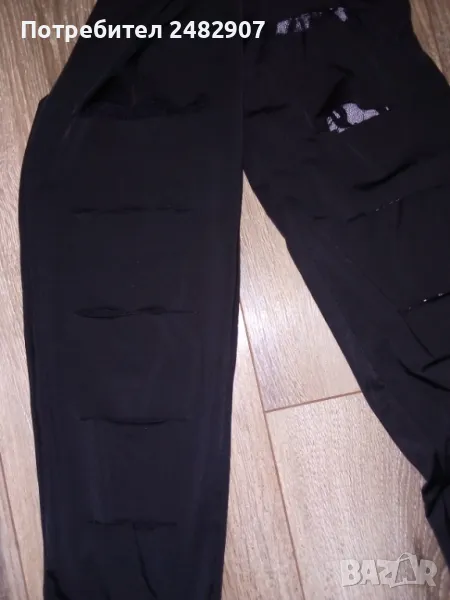 Ефектен черен дамски клин - ликра и дантела, размер S. Ширина в талията - 29 см, дължина от талията до чатала - 25 см, дължина от талията до долу - 90 см, ширина на крачола в долната част - 10,5 см. Чисто нов, не е използван, с шест хоризонтални прореза в предната част на двата крачола, през които прозира красива черна дантела, леко еластичен.