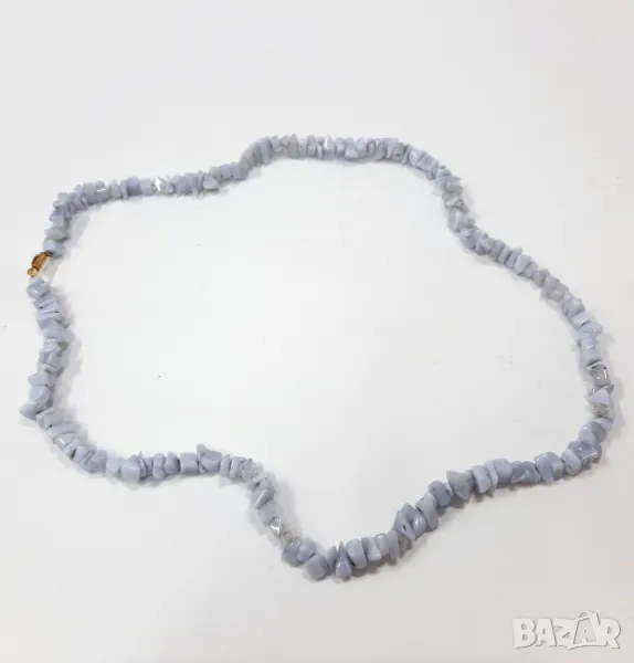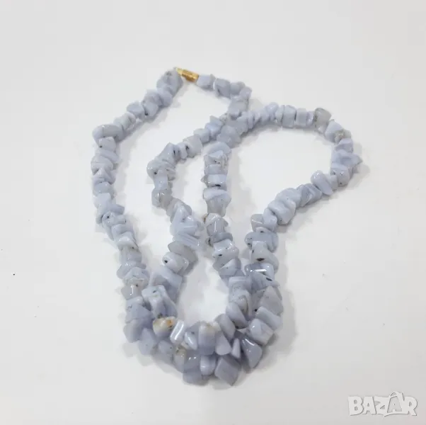 Предлагаме колие от мъниста с неправилна естествена форма и заоблени ръбове. Размер прибл. 1 см, показващ различни нюанси на сивото. Колието е с дължина около 60 см и тегло 55 грама. Приблизително еднаквият размер на мънистата и цветовото разпределение го правят елегантно бижу. Има месингова закопчалка. Колието е в много добро състояние.