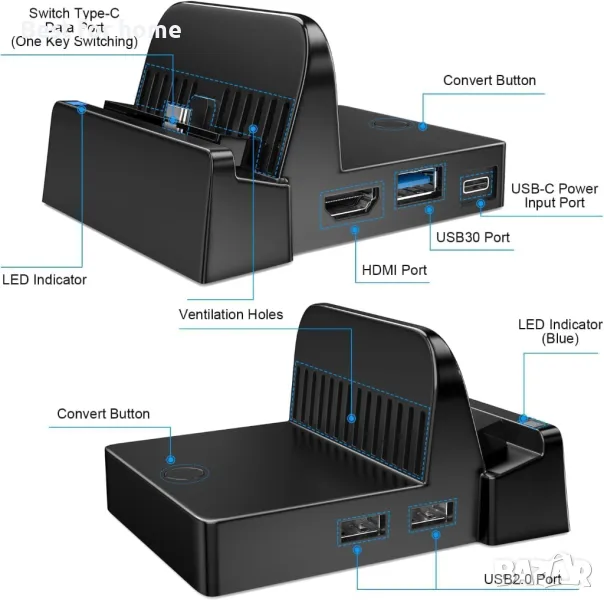 Докинг станцията за телевизор Nintendo switch поддържа 4K, 1080P и 720P видео изход (Nintendo Switch поддържа само 1080P), което прави екрана на играта по-ясен. Докинг станция за телевизор Nintendo switch Превключване на дисплея с едно докосване: Лесно превключване към режим TV и настолен с едно докосване