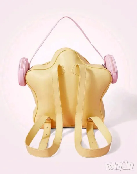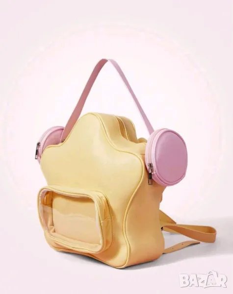 Нова жълта раничка с интересен дизайн. Изработена от еко кожа. Височина 31см, дължина 25см, дълбочина 10см.
