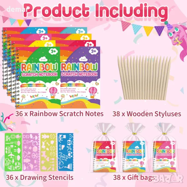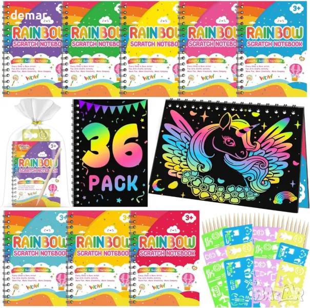 Този комплект от 36 тетрадки Rainbow Scratch е идеален за насърчаване на креативността на децата. Включва 36 тетрадки, 38 стилуса, 36 шаблона и 38 торбички за подаръци, позволяващи на децата да създават цветно изкуство, като издраскват черна повърхност. Идеални за партита и парти чанти, тези комплекти подобряват практическите умения и приятелства. Децата могат да рисуват, да си водят бележки и да правят забавни занаяти с безопасни, нетоксични материали, които са сертифицирани по CPC. Компактен и удобен за пътуване, той е фантастичен избор за подарък за рождени дни, празници и дейности по изкуства и занаяти.