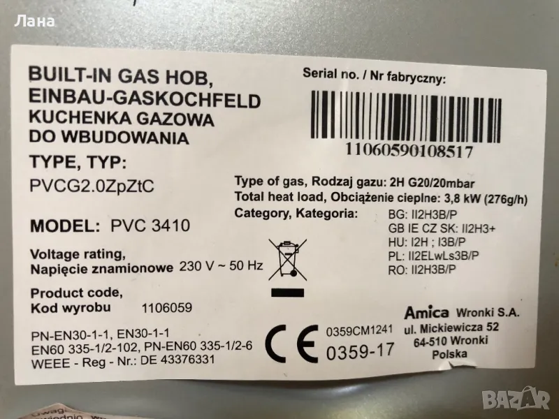 Плот за вграждане AMICA, нагревателни зони, газов, чугунена скара, електрическо запалване, черно скло, размери 30x52; доставка с Еконт, подробности в съобщение