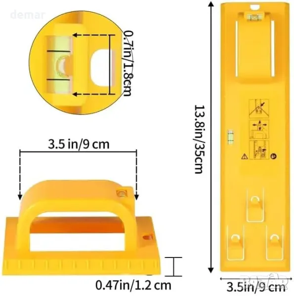Този инструмент разполага с вграден балонен нивелир за прецизно подравняване, заедно с насоки и маркировки за лесно регулиране на височината и центрирането. Включва интегрирана измервателна скала за точно поставяне и държач за молив за удобно маркиране. Изграден със здрава конструкция, той е проектиран да поддържа теглото на картината, като същевременно осигурява хоризонтално и право окачване на стената.