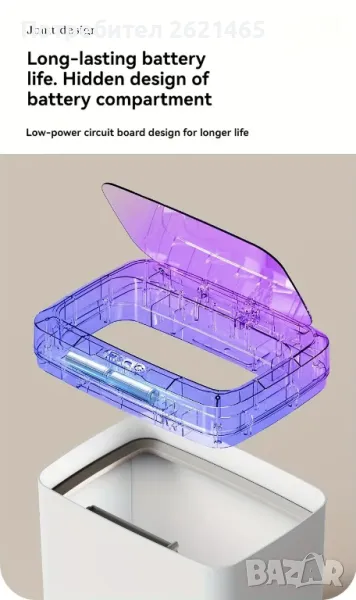 Механизмът за отваряне на коша се захранва с 2 батерии тип АА, които се поставят във вътрешната страна на капака. Капакът разполага и с 2 бутона за ръчно отваряне - On/Off.