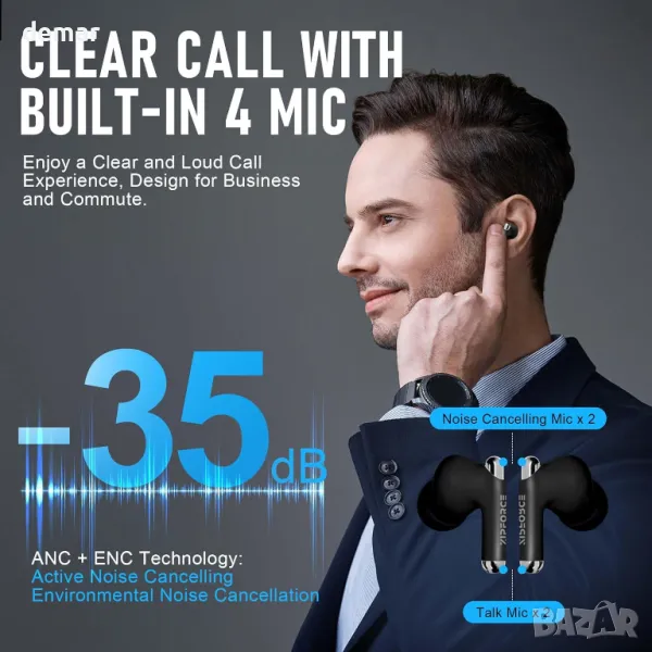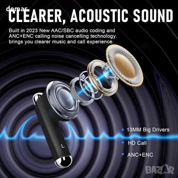 Тези безжични слушалки разполагат с усъвършенствано активно шумопотискане с три режима (ANC On, ANC Off и Transparency), за да се адаптират към всяка среда. Оборудвани с четири микрофона и ENC технология, те намаляват фоновия шум с 80%, осигурявайки ясни гласови повиквания. Bluetooth 5.3 предлага сдвояване с ниска латентност и стабилни връзки, с автоматично сдвояване в една стъпка за удобство. Ергономичният, ултралек дизайн (3,3 грама) осигурява удобно прилягане за дълготрайно носене, идеален за тренировки или ежедневна употреба. Бързото зареждане осигурява 5 часа време за възпроизвеждане само за 30 минути, с общо 40 часа при използване на кутията за зареждане.