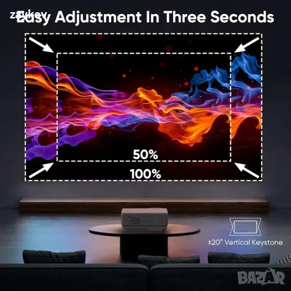 Преносим и се наслаждавайте на максимум 200-инчов екран: благодарение на компактния му размер можете лесно да го вземете със себе си в движение или да го поставите навсякъде в дома си, без да заема много място. Въпреки че размерът на проектора е малък, той може да прожектира екрана от 35 инча до максимум 200 инча чрез регулиране на прожекционното разстояние от 1,5-5 m. В допълнение, с функцията за мащабиране можете да регулирате размера на проекцията от 100%-50%, без да местите проектора.