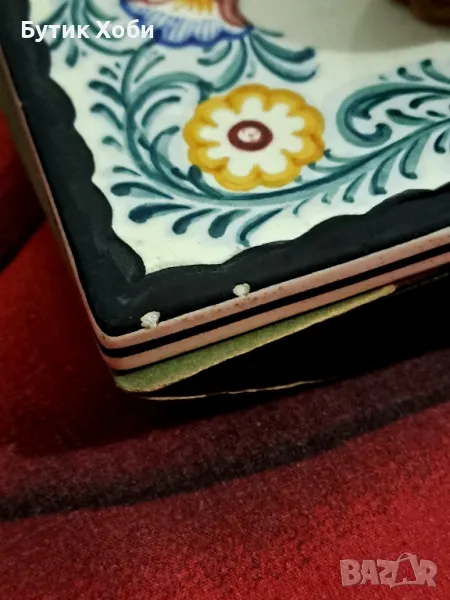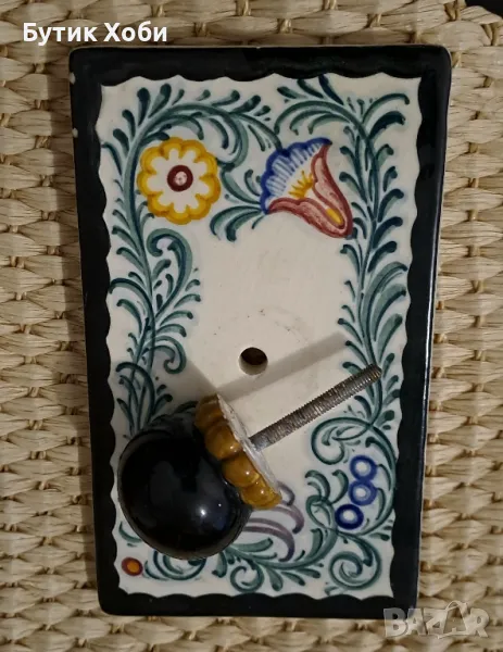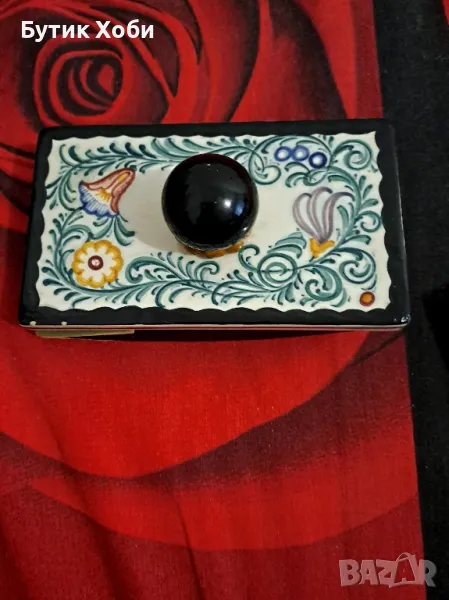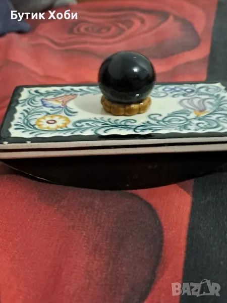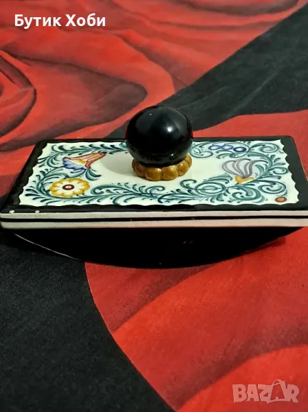 Рядка находка! Старинна попивателна за мастило от дърво и декоративен фаянс. Маркирана Baden ( Швейцария или Австрия ?) и номерирана. В отлично колекционерско състояние е ! Размери - 14×8,3×3,5см. Забележка : милимитрични люспи/точки по фаянса.