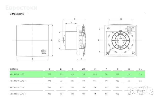 Вентилатор Vortice Punto Evo Flexo MEX 100/4 LL 1S T, 9 W, 220 V, 17,3 x 17,3 x 12,6 см.