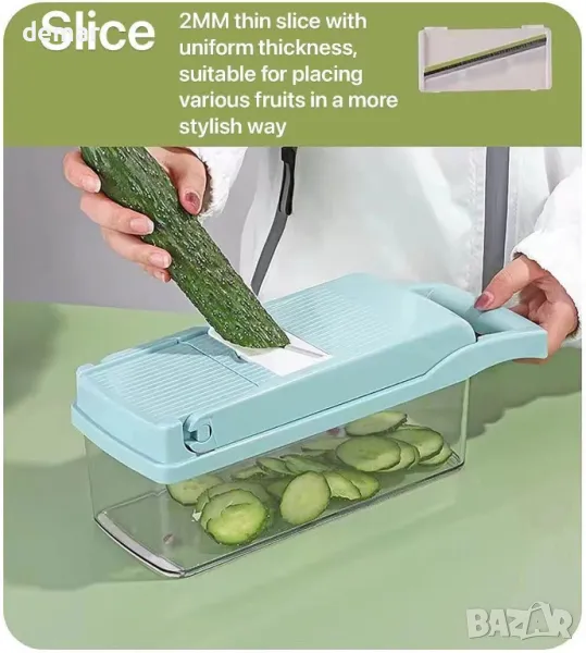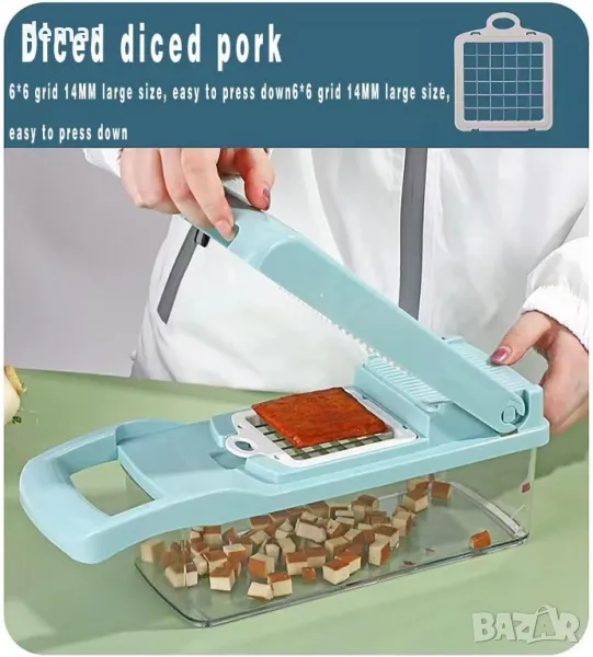 Този инструмент за рязане на зеленчуци 15 в 1 включва множество остриета за смилане на чесън, рязане, нарязване на кубчета, настъргване и други, заедно с аксесоари като сепаратор за белтък, кошница за отцеждане и предпазител за ръце. Изработен с остриета от неръждаема стомана и материали, подходящи за храна, той намалява времето за подготовка, като същевременно гарантира острота и издръжливост. Неплъзгащата се гумена основа осигурява стабилност на всякаква повърхност, а меката TPU ръкохватка подобрява контрола. Той е устойчив на ръжда, лесен за почистване в съдомиялна машина и компактен за удобно съхранение. Идеален за бързо нарязване на зеленчуци и плодове в различни форми и размери за здравословни ястия.