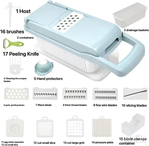 Чопър за зеленчуци, чопър за лук, 15 в 1 професионален чопър за храна, син