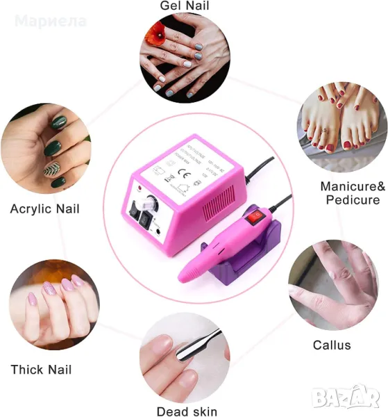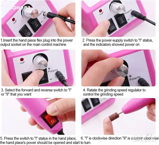 За естествени или изкуствени нокти, за шлайфане, изрязване, скулптуриране, полиране на всички видове ноктопластика. Дълготрайна употреба с 6 накрайника + шлифовъчни пръстени и четка за прах .