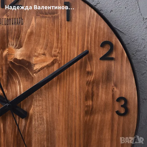 - Метални индикатори за час с дървени цифри.