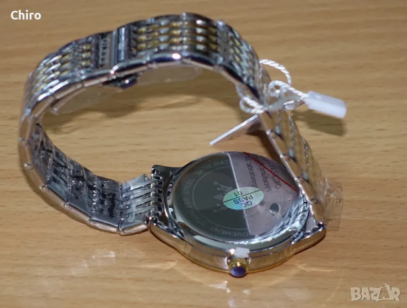 Водоустойчив до 30 м. дълбочина, тегло 92г., диаметър на циферблата 36 мм. Метална верижка 20 мм ширина. Продава се в оригинална заводска опаковка със запечатан пусков бутон- показан със стрелка на снимките.