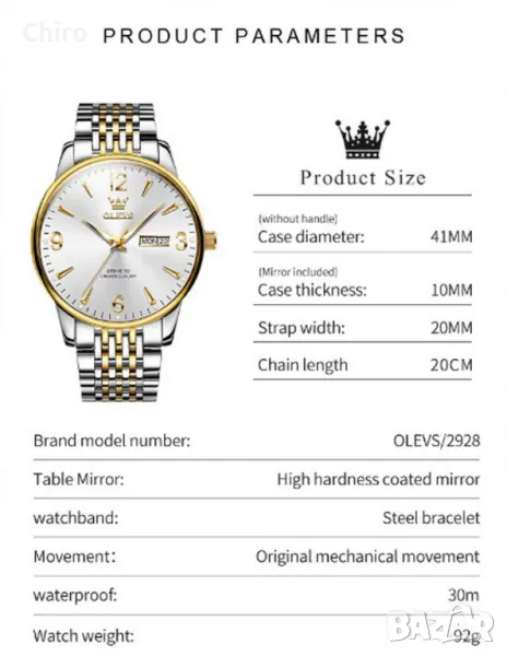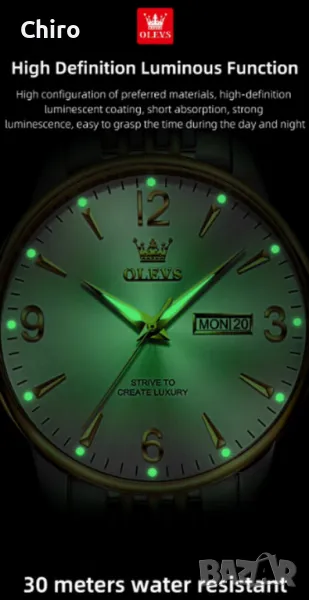 Чисто нов, качествен мъжки часовник OLEVS-2928 с кварцов механизъм, водоустойчив, индикация за дата и ден от седмицата. Луминисцентен циферблат светещ на тъмно. Заден капак от неръждаема стомана.