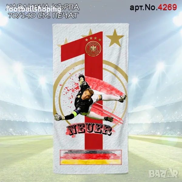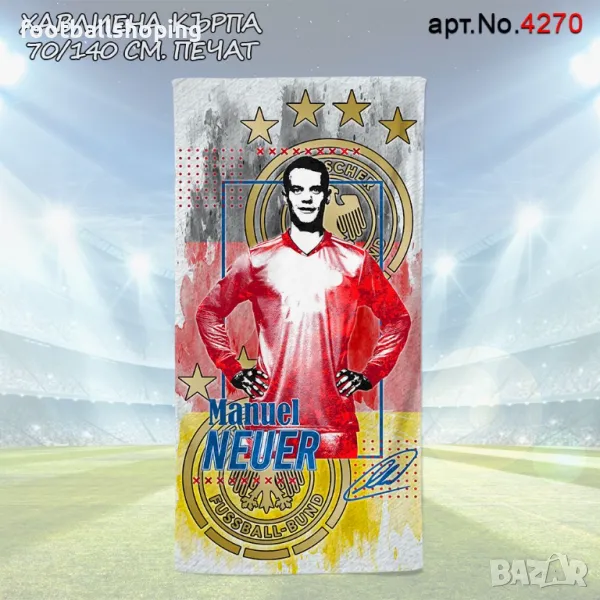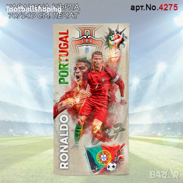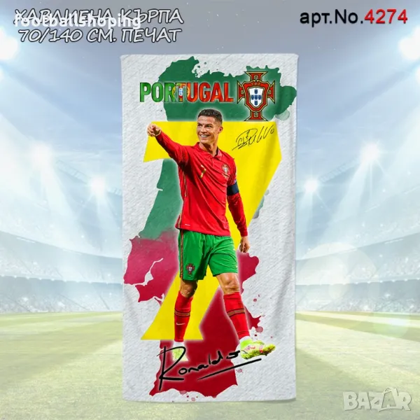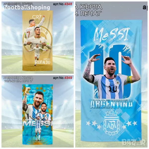 Предлагаме футболни памучни хавлии печат 30 модела.Размер 140/70см.Хавлии може да се изработят и в размер 50/30см.Цената на големите хавлии 140/70см е 30лв,а на малките хавлии 50/30см е 10лв.Хавлии може да се комбинират със памучни микрофибърни спални комплекти или декоративни възглавнички на любим футболист или отбор :) Възможност за закупуване на едро.Предлагаме много други футболни и спортни стоки.Моля разгледайте и другите обяви в профила ни :)