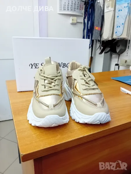Удобни леки и ефектни ,цвят шампанско подходящи за ежедневието с удобно ходило мека,стелка отвътре с хастар а лицевата част е комбинация от еко кожа и промазка.За повече инфо пишете !