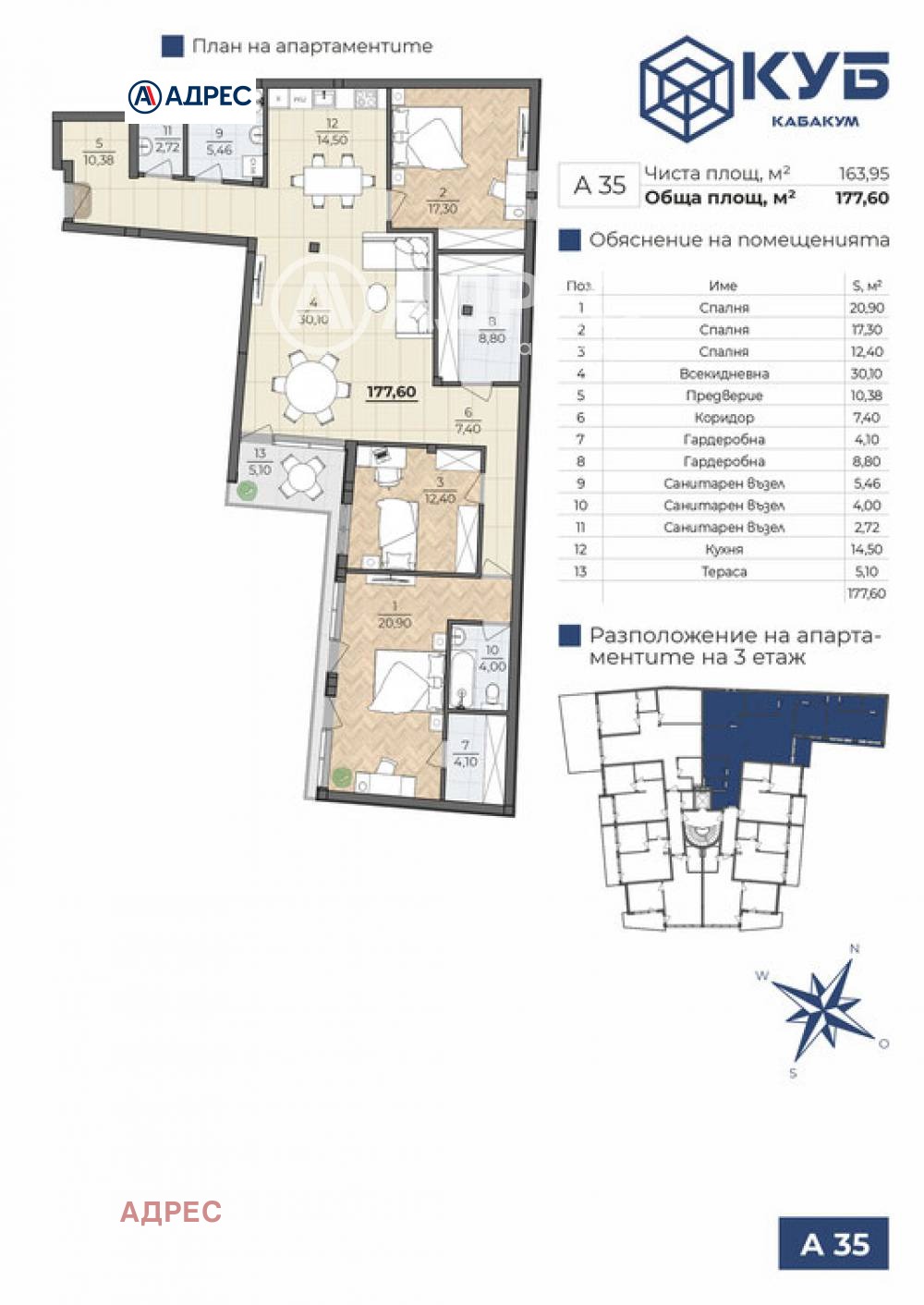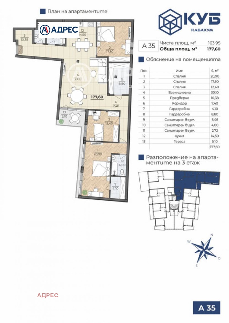 Многостаен тухлен апартамент в сграда в строеж на етап пред акт 15. Жилището се състои от просторна дневна с кухненски бокс, три спални, три санитарни възела, две гардеробни, входно антре и тераса. Куб Кабакум предлага хармонично съчетание на модерност, комфорт и естествена красота на първа линия на морето.