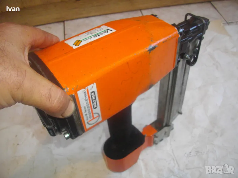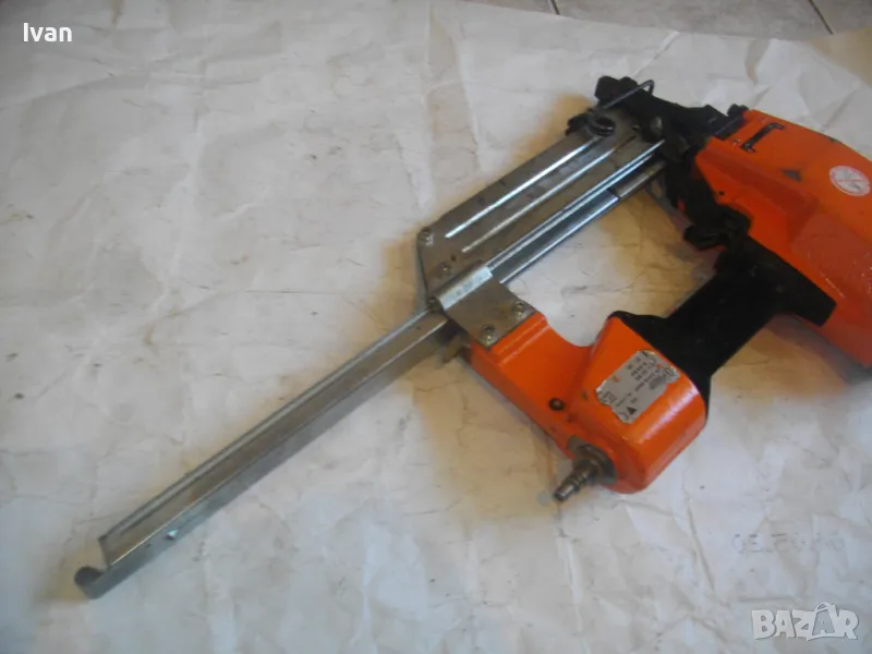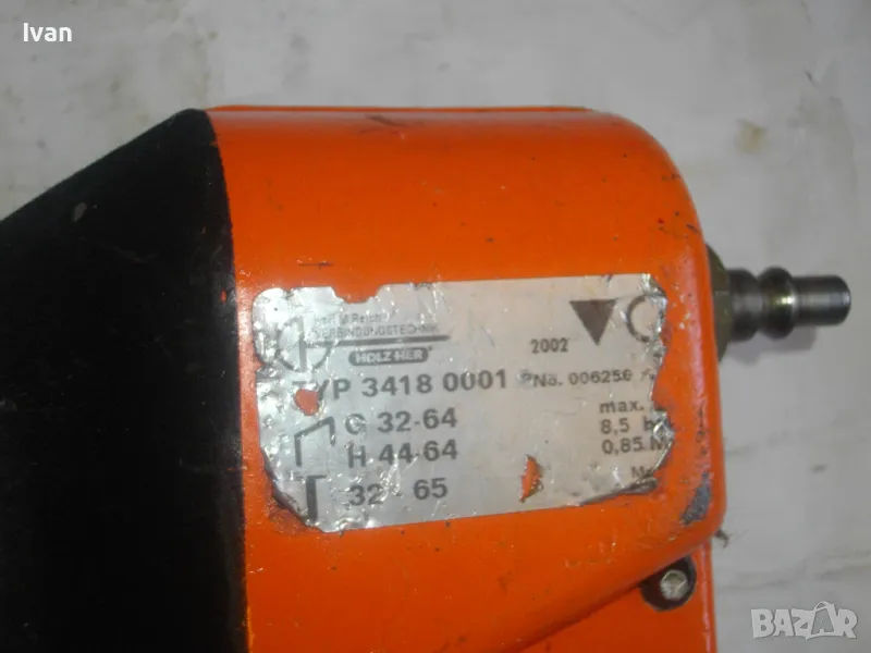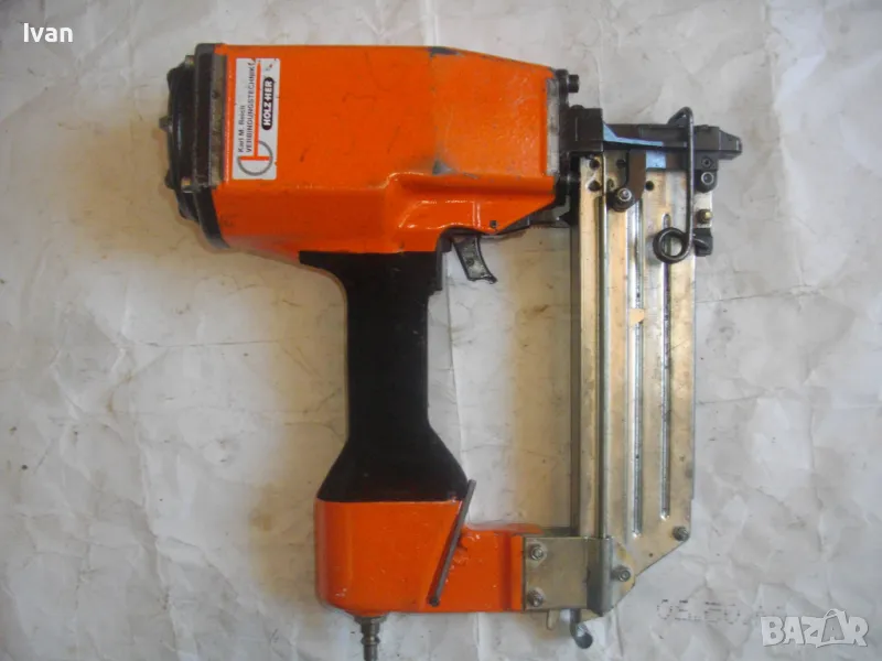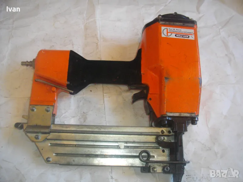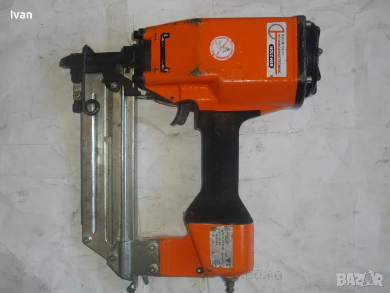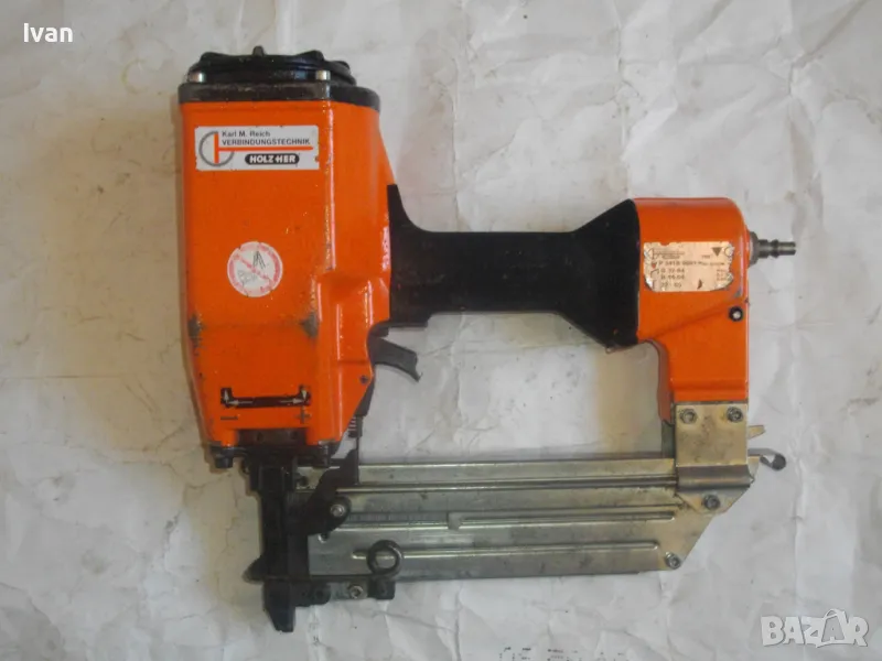 ОПИСАНИЕ на оранжев пневматичен такер голям HOLZ-HER. Комбиниран за скоби тип G размер 32-64мм, тип H размер 44-64 мм и пирони размер 32-65 мм. Немски професионален индустриален промишлен. Марка модел маркировки производител HOLZ HER Typ 3418 0001 Karl M. Reich Verbindungstechnik Made in Germany. Почти нов, много запазен външен вид и отлично работно техническо състояние. Макс налягане на компресор - max 8,5 bar. Пълнител изцяло стомана, корпус изцяло алуминий. Дръжка с ингпрегнирано черно платово фабрично меко покритие. Вградено място на корпуса за ключ шестостен шестограм за отворяне на главата при заседнала скоба. Оригиналният ключ е наличен на мястото си. Поставен оригинален щуцер бърза връзка за скачване с маркуч на компресор. В пълнителя са заредени блистер скоби размер 32 мм. Размери на такера 310х330х100 мм. Тегло на такера - 4,0 кг.