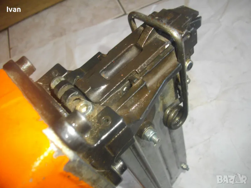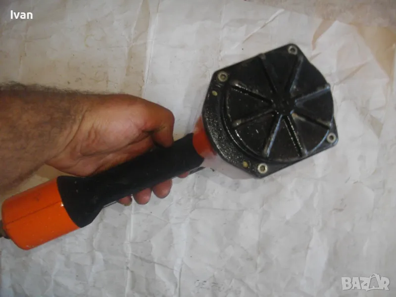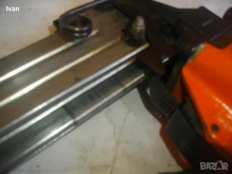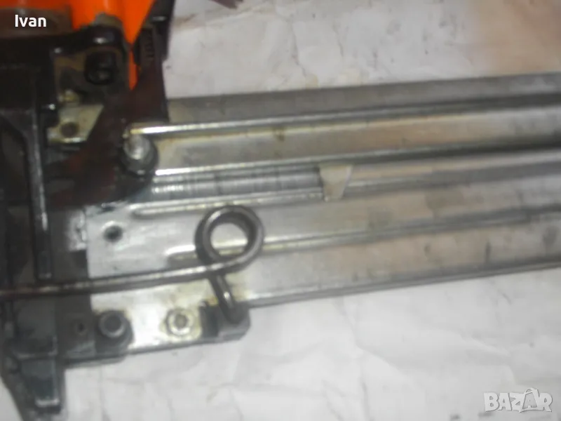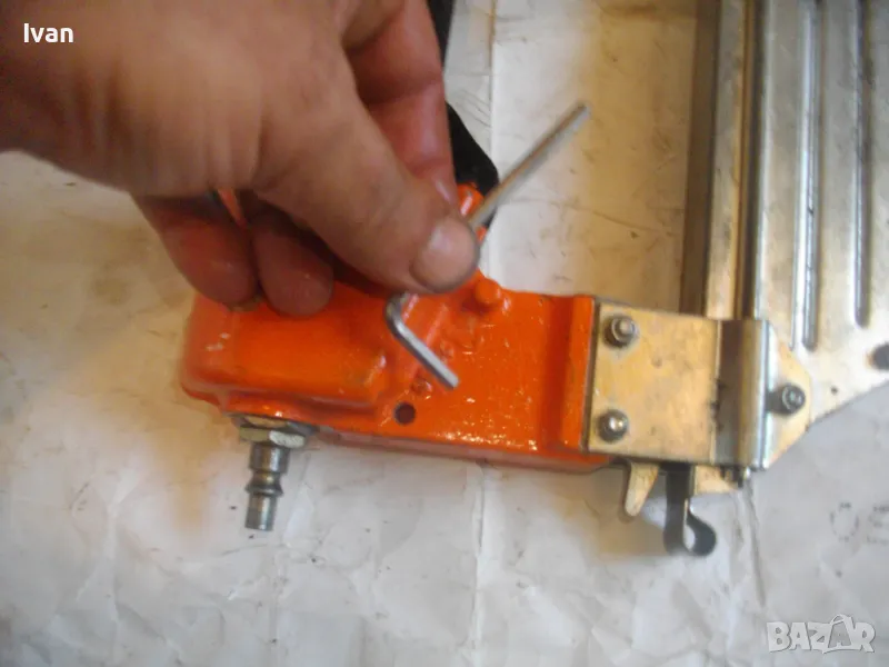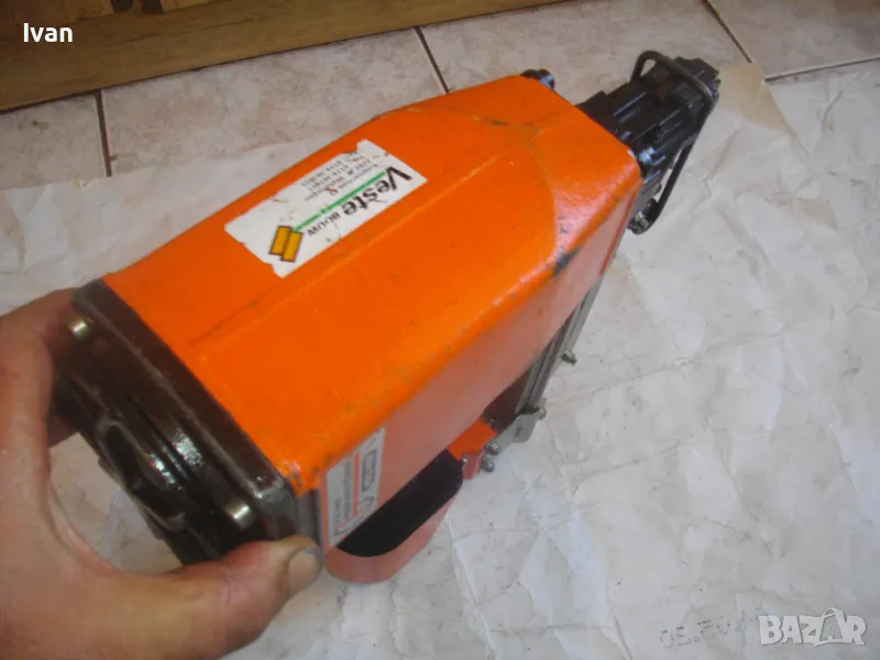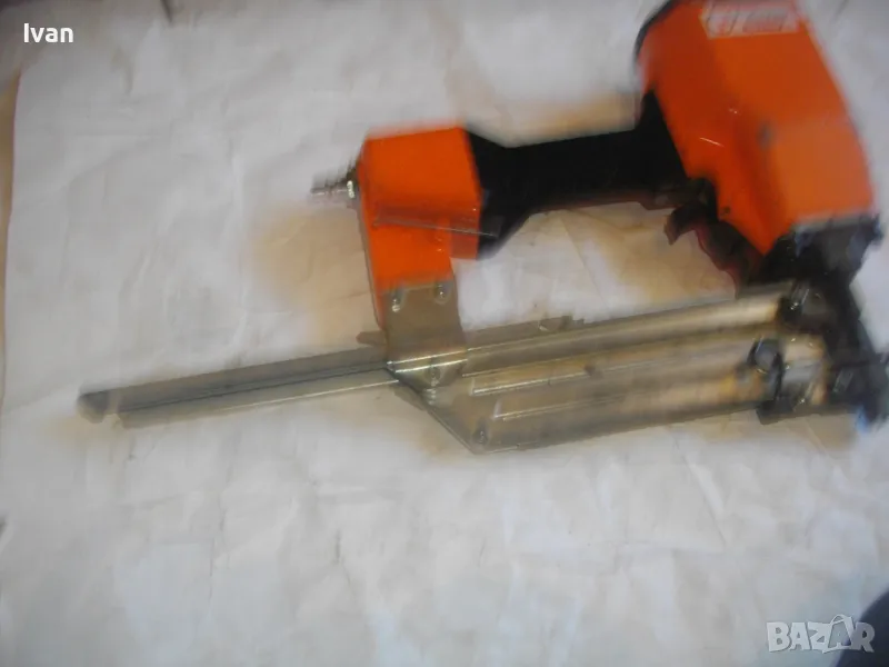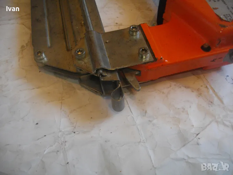 ОПИСАНИЕ на оранжев пневматичен такер голям HOLZ-HER. Комбиниран за скоби тип G размер 32-64мм, тип H размер 44-64 мм и пирони размер 32-65 мм. Немски професионален индустриален промишлен. Марка модел маркировки производител HOLZ HER Typ 3418 0001 Karl M. Reich Verbindungstechnik Made in Germany. Почти нов, много запазен външен вид и отлично работно техническо състояние. Макс налягане на компресор - max 8,5 bar. Пълнител изцяло стомана, корпус изцяло алуминий. Дръжка с ингпрегнирано черно платово фабрично меко покритие. Вградено място на корпуса за ключ шестостен шестограм за отворяне на главата при заседнала скоба. Оригиналният ключ е наличен на мястото си. Поставен оригинален щуцер бърза връзка за скачване с маркуч на компресор. В пълнителя са заредени блистер скоби размер 32 мм. Размери на такера 310х330х100 мм. Тегло на такера - 4,0 кг.