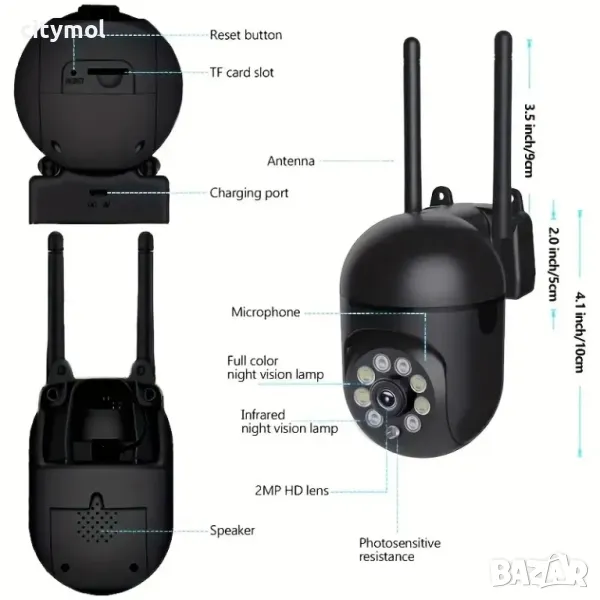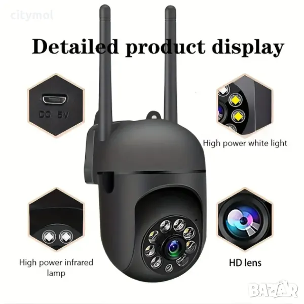 Камерата е моторизирана и се завърта във всички посоки. Управлението става директно, чрез смартфона – отдалечено. 355 градусово хоризонтално завъртане и 90 градусово вертикално. Отлично качество на картината с реални 5 MPx, бленда, 4 mm. 2 броя силни Wi Fi антени. Улеснена инсталация без изискване за допълнителни познания. Камерата се завърта във всички посоки, по този начин можете да обхванете по-голям периметър. Управлението става директно през смартфона, отдалечено.