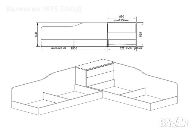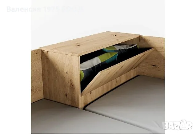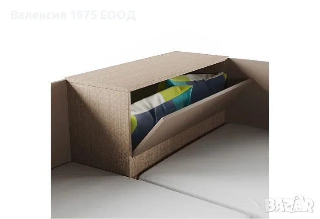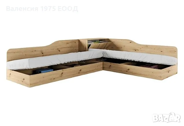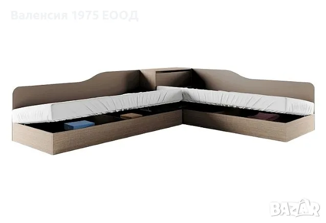 Ъглови легла с ракла, повдигащ пружинен механизъм за еднолицеви матраци 82/190 см ( матракът стъпва на касата) и делител в подматрачното пространство, който от една страна го разделя на две по-удобни части за съхранение, а от друга, заздравява значително цялостната конструкция.