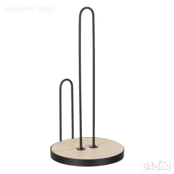 Поставка - държач за кухненска рулонна хартия, черен металик с дървена основа и ограничител за по-лесно отрязване на хартията.