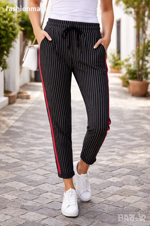 Цена: 13.50€ / 26,40лв. Панталонът е в светлосив цвят с фини вертикални бели райета, които визуално издължават силуета. От двете страни по цялата дължина на крачолите преминават широки червени ленти (кант), които придават на модела динамичен и спортен вид. Разполага с практични странични джобове. Панталонът е със свободна кройка в горната част, която леко се стеснява надолу към глезените. Състав: 40% вискоза, 50% полиестер, 10% еластан