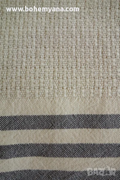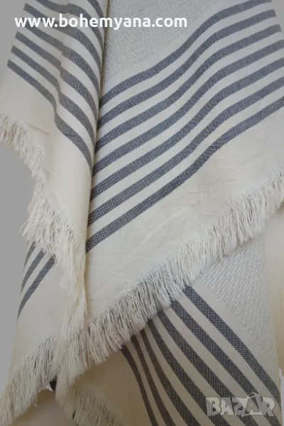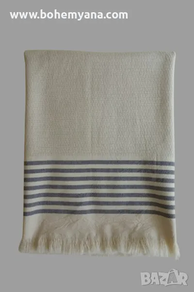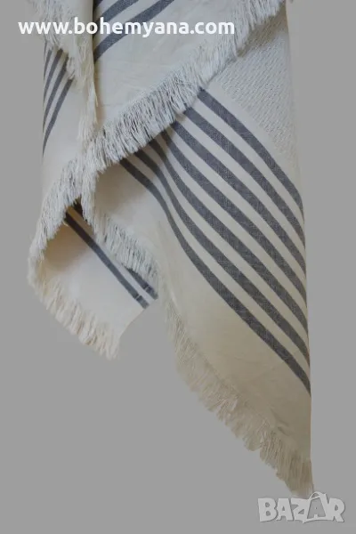 ръка от лен и памук с Oeko-Tex сертификат. Семпъл дизайн със сиво райе в краищата. Комбинацията от лен