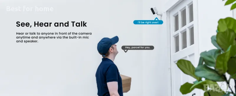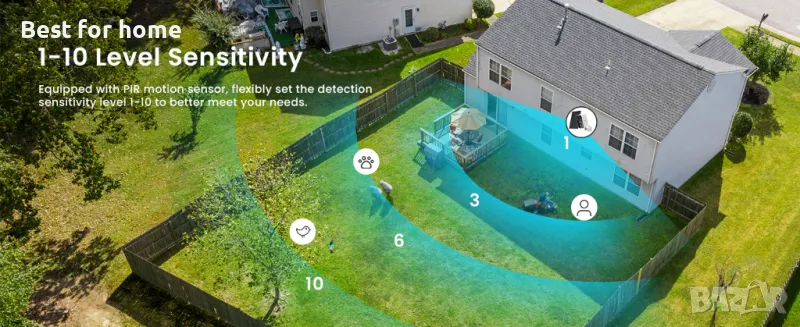 AI & PIR откриване на движение и алармено известие в реално време - Най-новият механизъм за бърза реакция AI/PIR на wifi камера интелигентно идентифицира хора/превозни средства/кучета/котки/пакети и изпраща алармени известия (0,2s-3s). Когато бъде засечено движение, той изпраща незабавни алармени известия, записва алармено видео и аудио и активира сирена и прожектор, за да възпира нежелани посетители.