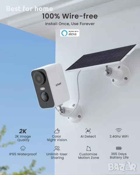 Лесен за инсталиране за 1 минута и 100% безжично и захранвано със слънчева енергия - безжичните външни камери за сигурност на ieGeek се доставят със слънчеви панели за постоянно захранване и компактен дизайн, няма нужда от кабели, лесно се инсталират за 1 минута и се свързват за 10 секунди. Не поддържа 5GHz wifi.