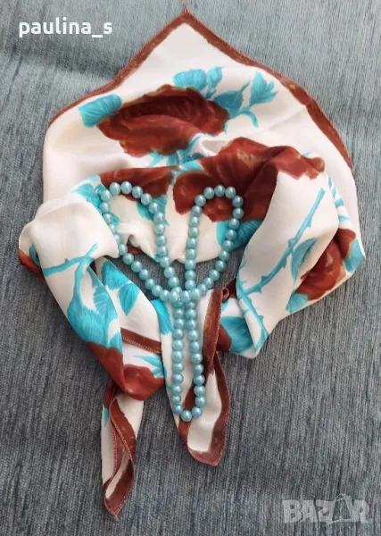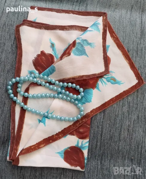 забрадка с кафяви рози - Цената е крайна 39,99лв / 20 евро. Коприната е пясъчна, невероятно нежна на допир, а Шалът е атракция за окото. 64см / 64см. Герданът със сини перли е също Винтидж артикул, от времето на соц-а; подходящ е за декорация и е на цена - 9,99лв / 5 евро. Може и отделно, но предпочитам артикулите да не се делят.