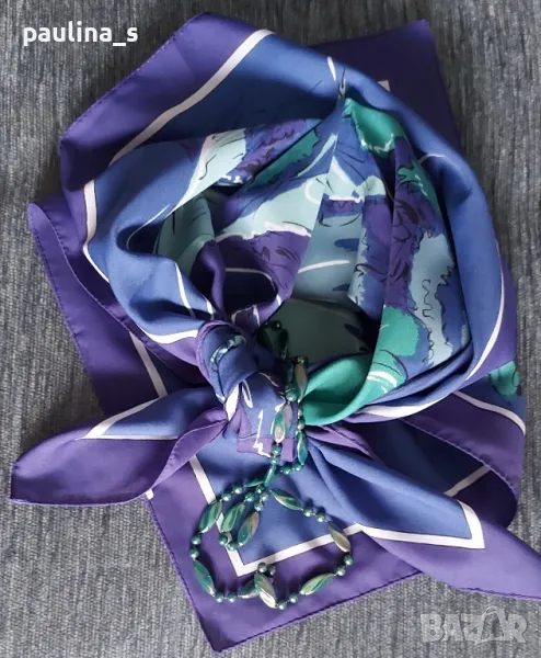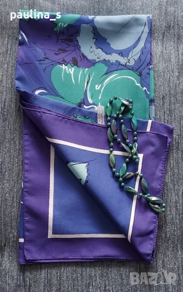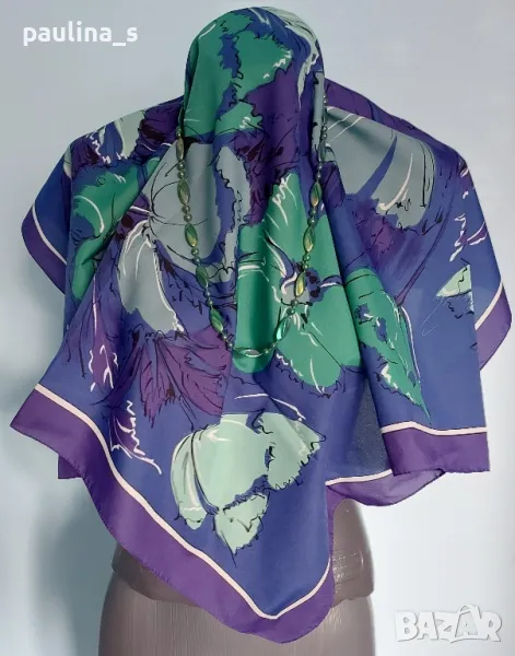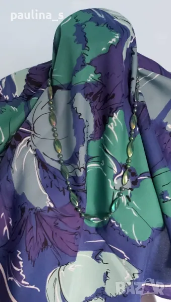 2️⃣. Колаж / Винтидж / Цената е крайна 24,99лв / 12,5 евро. Като нов, не е носен! Разкошен винтидж шал от времето на соц-а, внос от Италия, купен от "Валентина" с връзки. Размери 76см / 76см. Десенът е уникален, състояние видимо от снимките. Герданът е ръчна изработка от неподвижни полихромни мъниста в зелено, 70см, винтидж, нов - цена 9,99лв / 5 евро. Колажите са на различни шалове, които предлагам в други мои обяви.