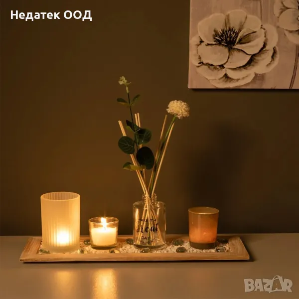Комплект с дървена основа, стъклени витрини 7х10см, 5,5х7см, 5,5х5см, резо, клечки, стъклена бутилка за ароматно масло (не е включена) 5,5х8см, растения и декоративен чакъл и прозрачни камъни.