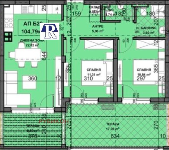 Разпределението на апартамента е както следва: дневна(22.82кв.м), спалня(11.31кв.м.), спалня(10.84кв.м.), антре(5.96кв.м.), баня с тоалетна(3.60кв.м), тоалетна(1.74кв.м.), тераса(17.95кв.м), тераса и склад кв.м. Общо площ (104.79кв.м.). Цена 89072евро! Към жилището имате възможност да закупите и паркомясто или гараж , което се заплаща допълнително.