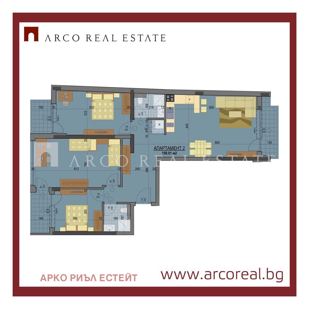 Апартаментът е разположен на втори етаж и е с чиста площ от 129.21 кв.м., обща РЗП от 150.10 кв.м. Жилището се състои от хол с кухненски бокс, три комфортни спални, две бани с тоалетна, антре и три тераси, които осигуряват допълнително пространство за отдих и комфорт.