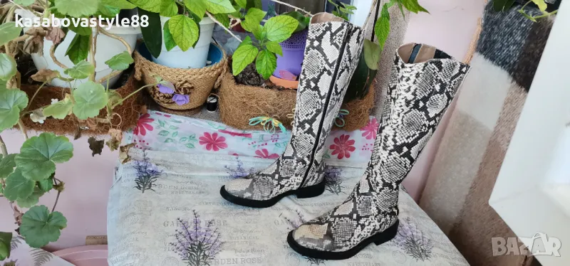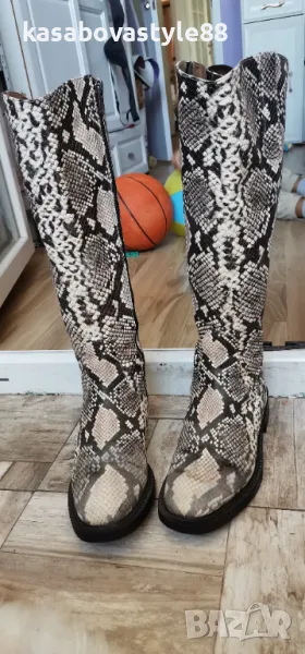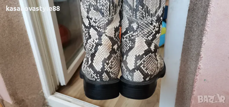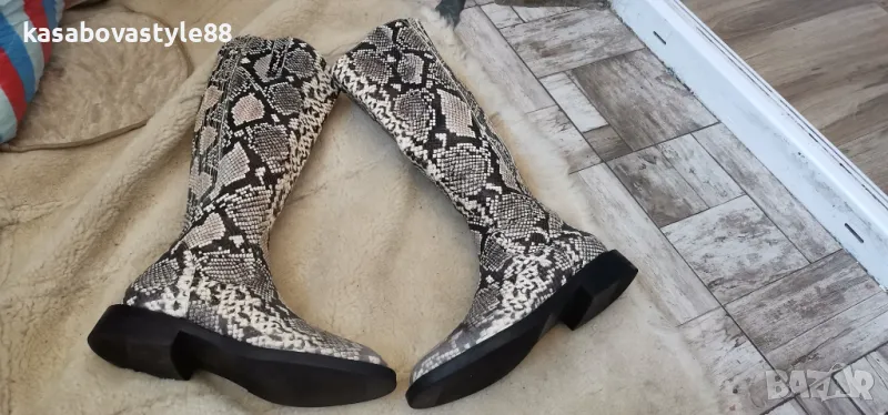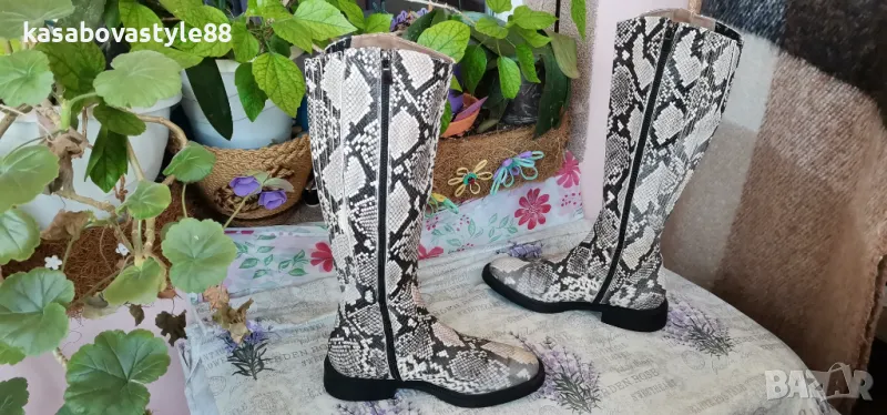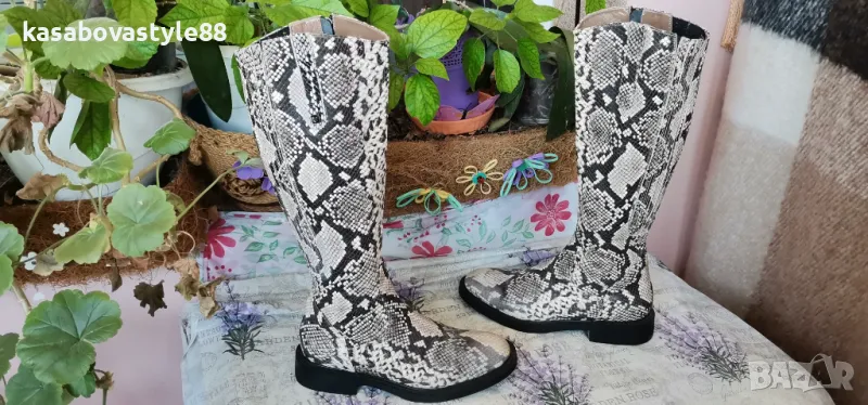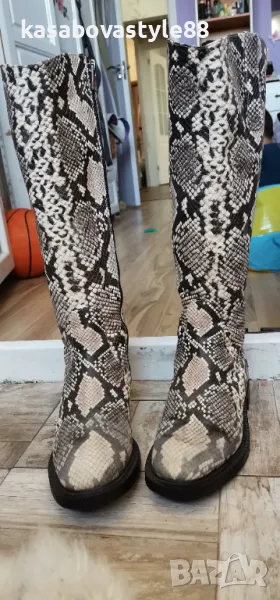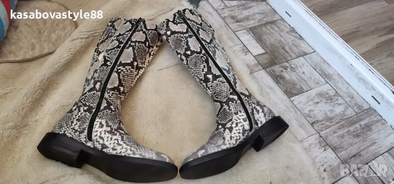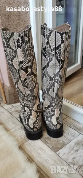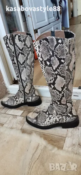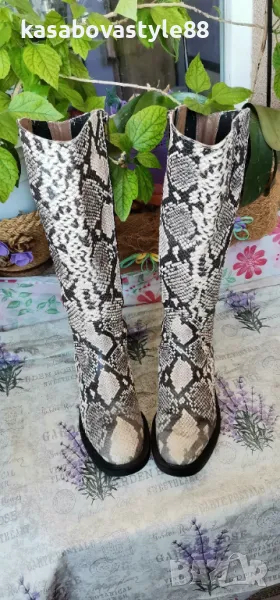 Високи дамски ботуши от естествена кожа с ефектна щампа от змийска кожа.Обувани броени пъти, неразличими от нови! Моделът разполага със странични ципове за по-лесно обуване и събуване, както и дискретни ластици в горната част,регулуращи ширината на прасеца. Ходилото е с височина 3 см. Цялостна височина отзад 39.5см.Дължина на стелка 24.5см