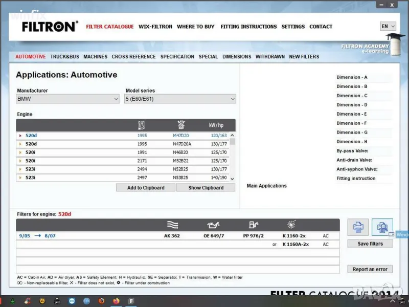 ,така и за камиони . Съдържа информация за филтър за купе,горивен филтър