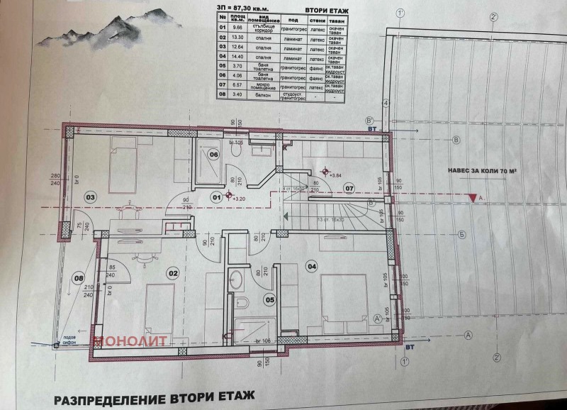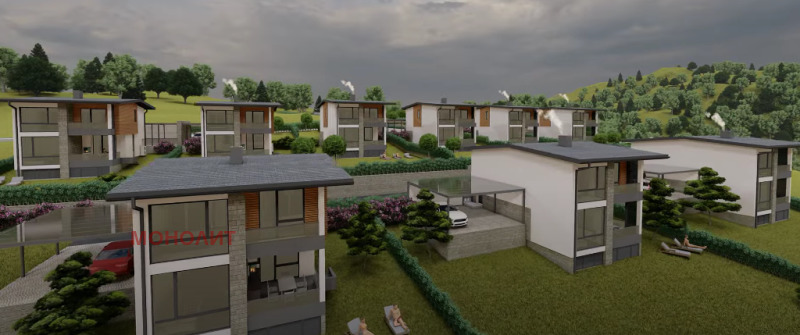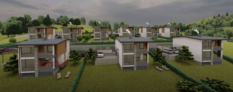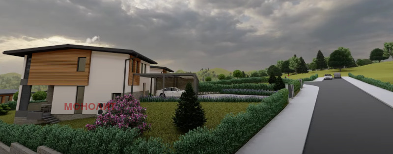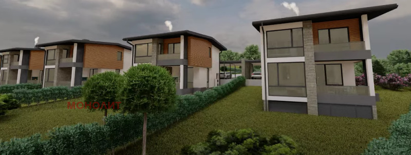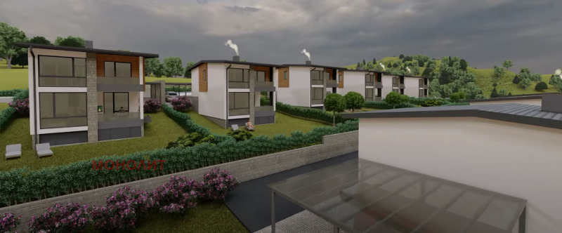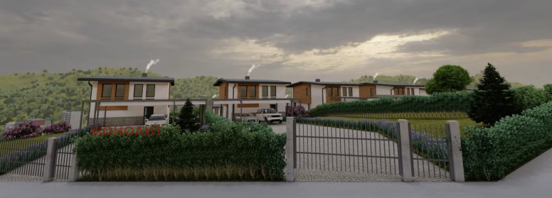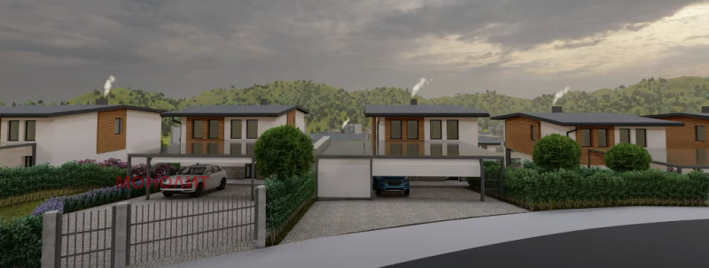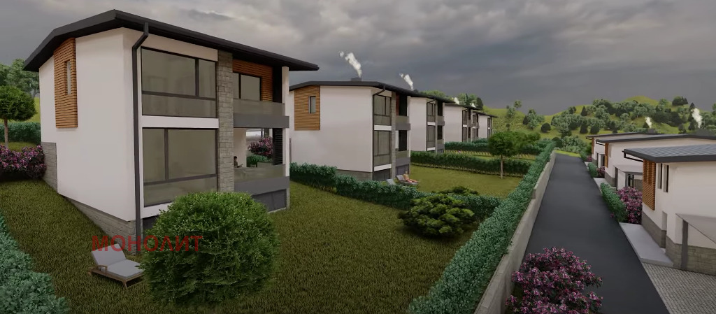 гнайс, с изпълнена вертикална планировка - павета Semmelrock, озеленяване и поливна система. Първи етаж - предверие, техническо помещение, еднопространствена кухня - трапезария - дневна, сервизно помещение, тераса. Втори етаж - три спални, като едната е със самостоятелно сервизно помещение, мокро помещение, сервизно помещение, балкон. Към всяка къща ще има навес 75 кв.м. за три паркоместа, който ще е от масивна метална конструкция и с покривни термопанели. Къщата ще бъде и захранена и с газ. Въвеждане в експлоатация края на 2026г.