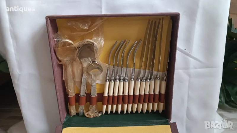 Комплекта се състои от 24 прибора - виждат се на снимките (6 вилици + 6 ножа + 6 чаени лъжици + 6 лъжици за кафе).