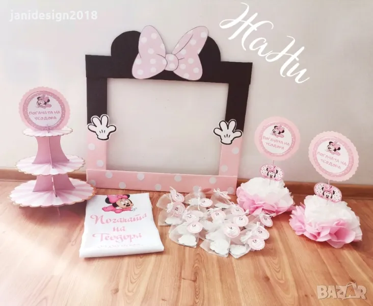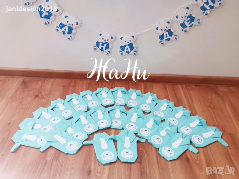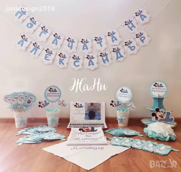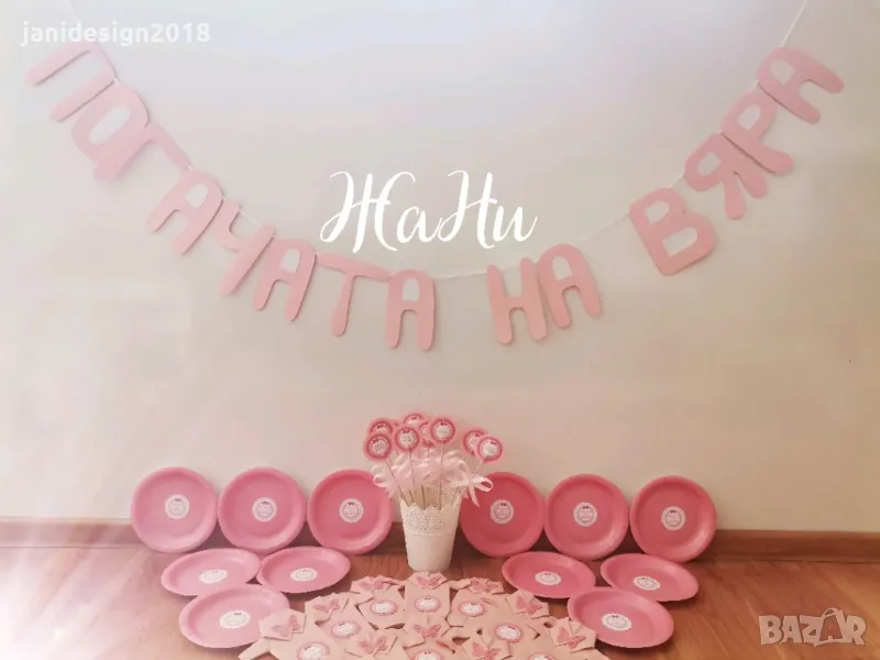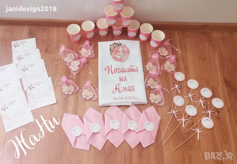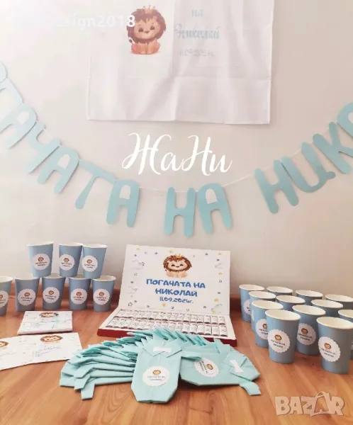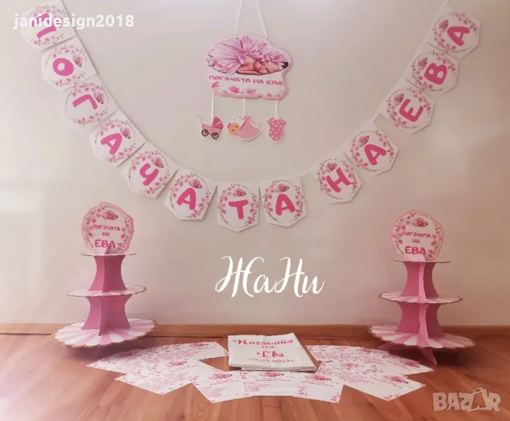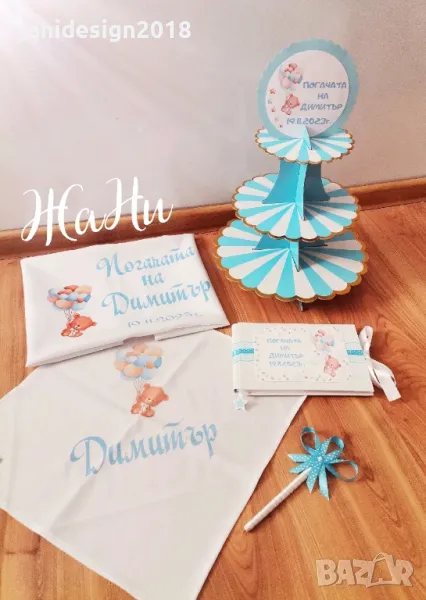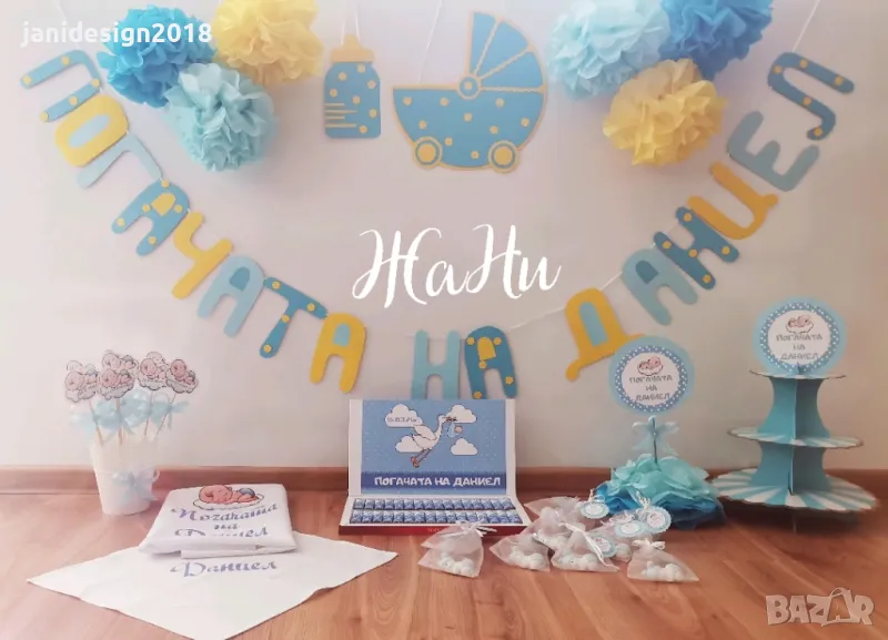 Украса За бебешка погачаВсеки клиент сам избира какви аксесоари желае да включва украсата, както и нужната бройка. * надпис* Месал за разчупване на питката с името на детето и датата (печат /текстилно фолио)* малка кърпичка за паричките с име *боди с име и дизайн съобразен с темата на празника *бонбони с дизайн съобразен с темата на празника * рамка А4 формат с бебешка визитка или надпис по избор*книга за пожелания с химикал * карти за пожеланията на орисниците, може да се поставят в папка * топки и цветя от тишу за украса * чаши * чинийки * вилички * Сламки* покривка за маса * Салфетки боди/рокля/риза/едноцветни с декорация по темата * топери с пожелания за орисане на бебе кръгли или във форма на животни, със снимка на детето или с надпис по поръчка за украса или подаръчета за гостите *Украса За маса * стойка за мъфини* топери за мъфини * формички за мъфини *табела за врата и за маса * табела бебешко шише * табела бебешка количка с надпис * Покани * подаръчета за гостите