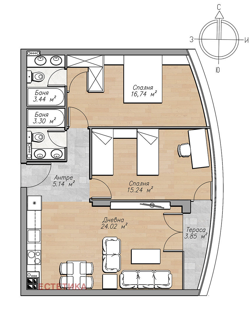 Апартаментът се намира на шести етаж в сграда с асансьор и отлични общи части. Жилището е с площ от 100 м2, като жилищната площ е разпределена максимално ефективно и функционално: Антре, Дневна с кухня и трапезария, Родителска спалня с баня WC, Спалня с баня и WC, от днвете спални се излиза на тераса.