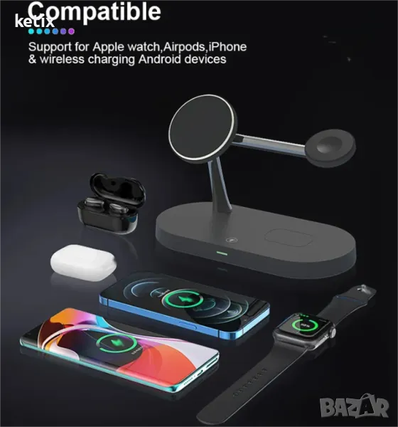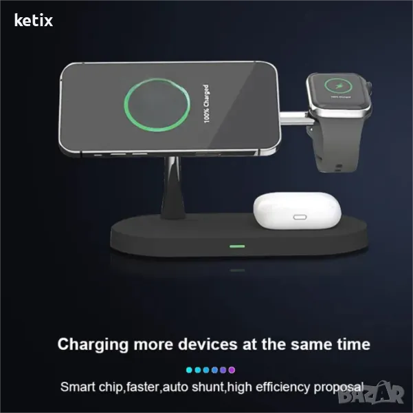 Бърза безжична зарядна станция 5 в 1, с модерна технология и минималистичен дизайн, за телефони с MagSafe. Благодарение на тези функции можете да зареждате всички устройства едновременно.