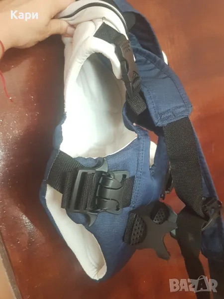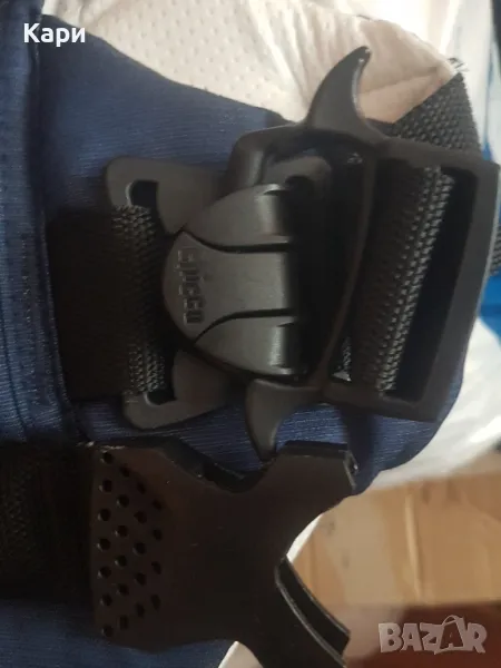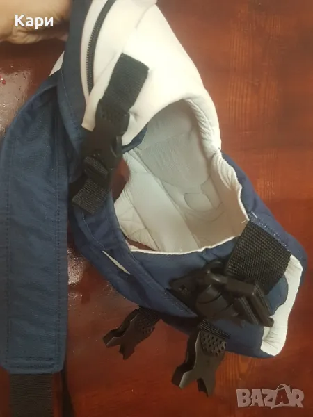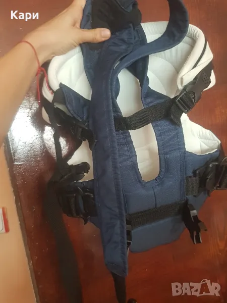Кенгуру чичо,в много добро състояние,почти ново,една забележка имаше за главата с цип като възглавничка но не я намирам,ние го носехме без това от бебе,и я махнах веднага,за това не я откривам.без проблем и удобно се носи така бебето,кенгурото е много хубаво,здраво меко като с мемори пяна,нз състава и т.н не чела,купих го направо,с широки колани.цвета е тъмно синьо и бяло,ергономична система,дишаща материя за топлите дни,няколко позиций на носене.